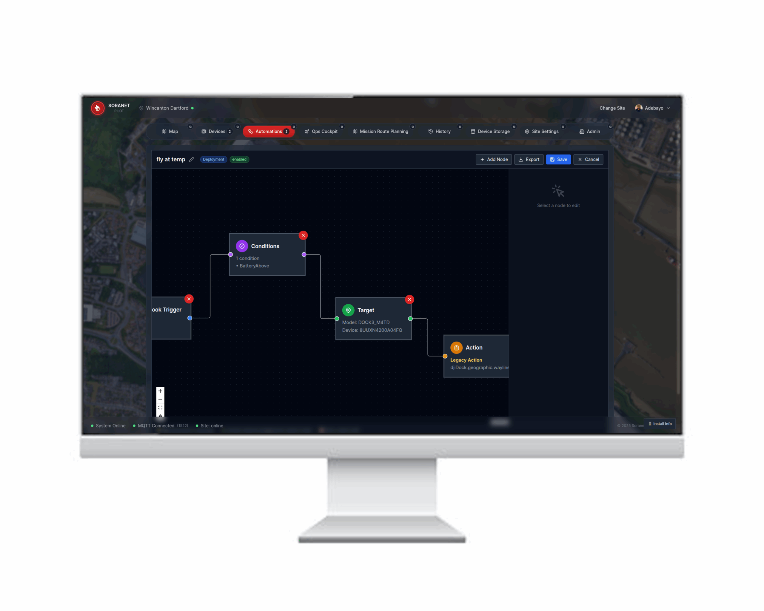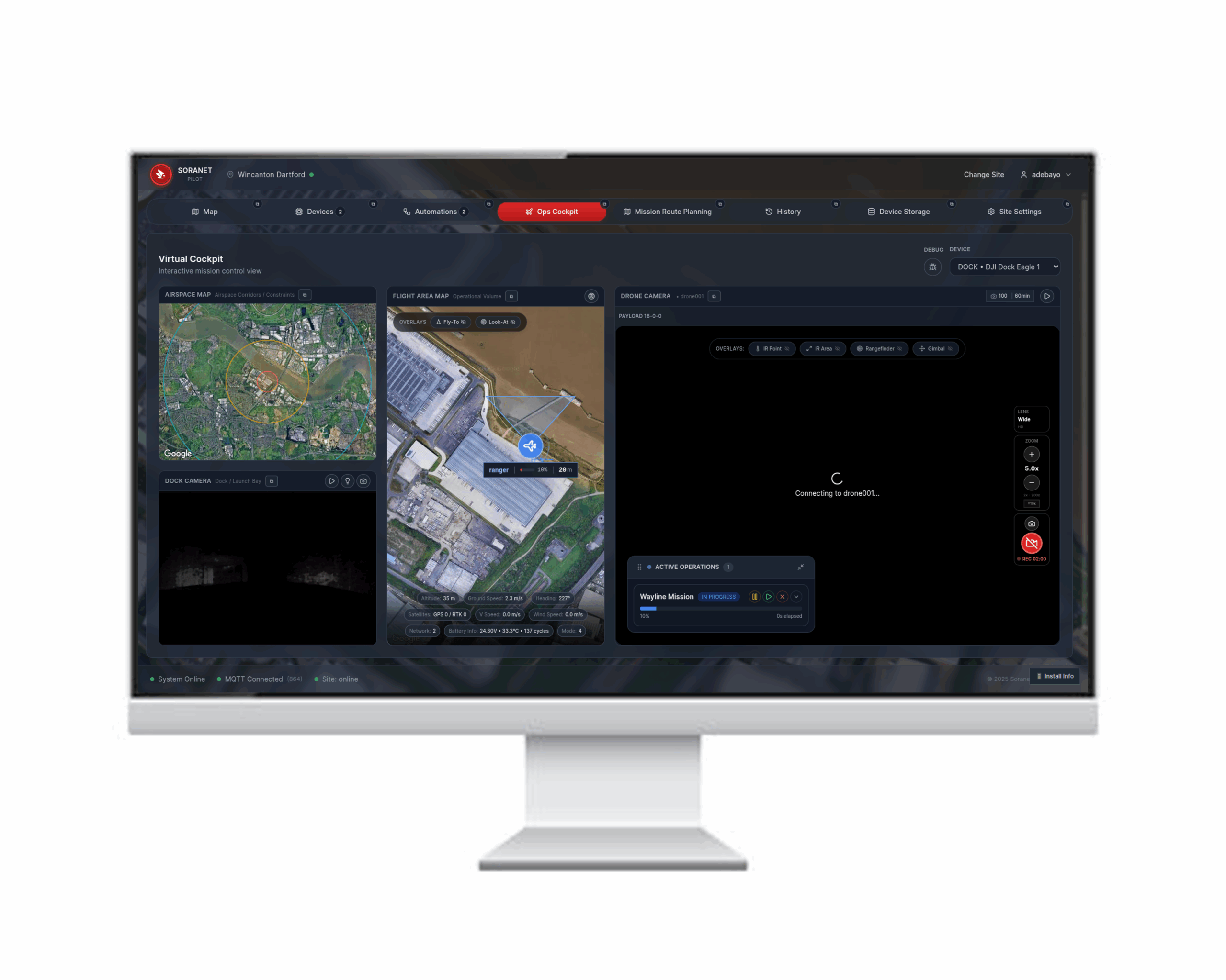 The Soranet™ Pilot Platform is your primary drone control station — Managing deployments, monitoring triggers, and automating processes through one seamless interface.